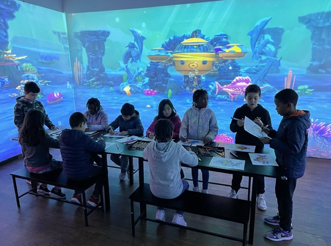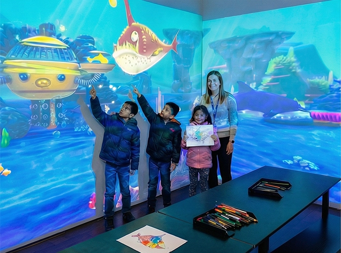 Sketch Aquarium is a creative, interactive experience where art, imagination, and technology come together. Participants draw and color sea creatures (and more), then scan their artwork and watch it come alive on our large interactive digital walls—like “living” art. Guests can interact with their creations in real time as they move through a shared world. The experience includes 8 different themed environments—such as the Ocean, Dinosaur World, Jungle, and more—so every visit feels fresh and exciting. It’s a hands-on activity that blends creativity with light movement and interactive play, creating memorable fun for all ages