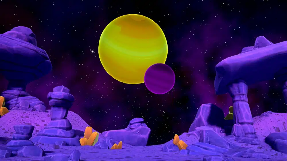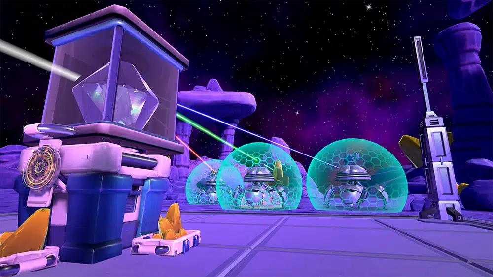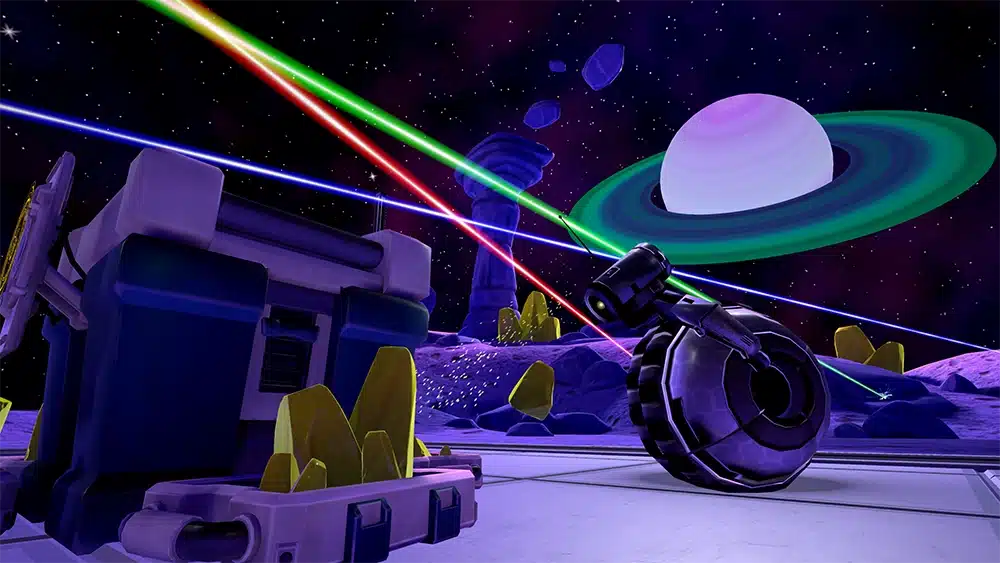 You are on a mining platform on an asteroid mining yellow crystals. Your team is preparing for evacuation when a giant robot on wheels shoots your evacauation ship out of the sky! You’ll need to destroy the giant robot before your ship can come back in and you’ve only got 10 minutes before the giant robot crushes you! Fortunately, your team has access to a giant laser that is powered by yellow crystals that can be found powering the robots around here. Using your laser swords and shields, you will have to deflect lasers, collect crystals and explode robots to survive.