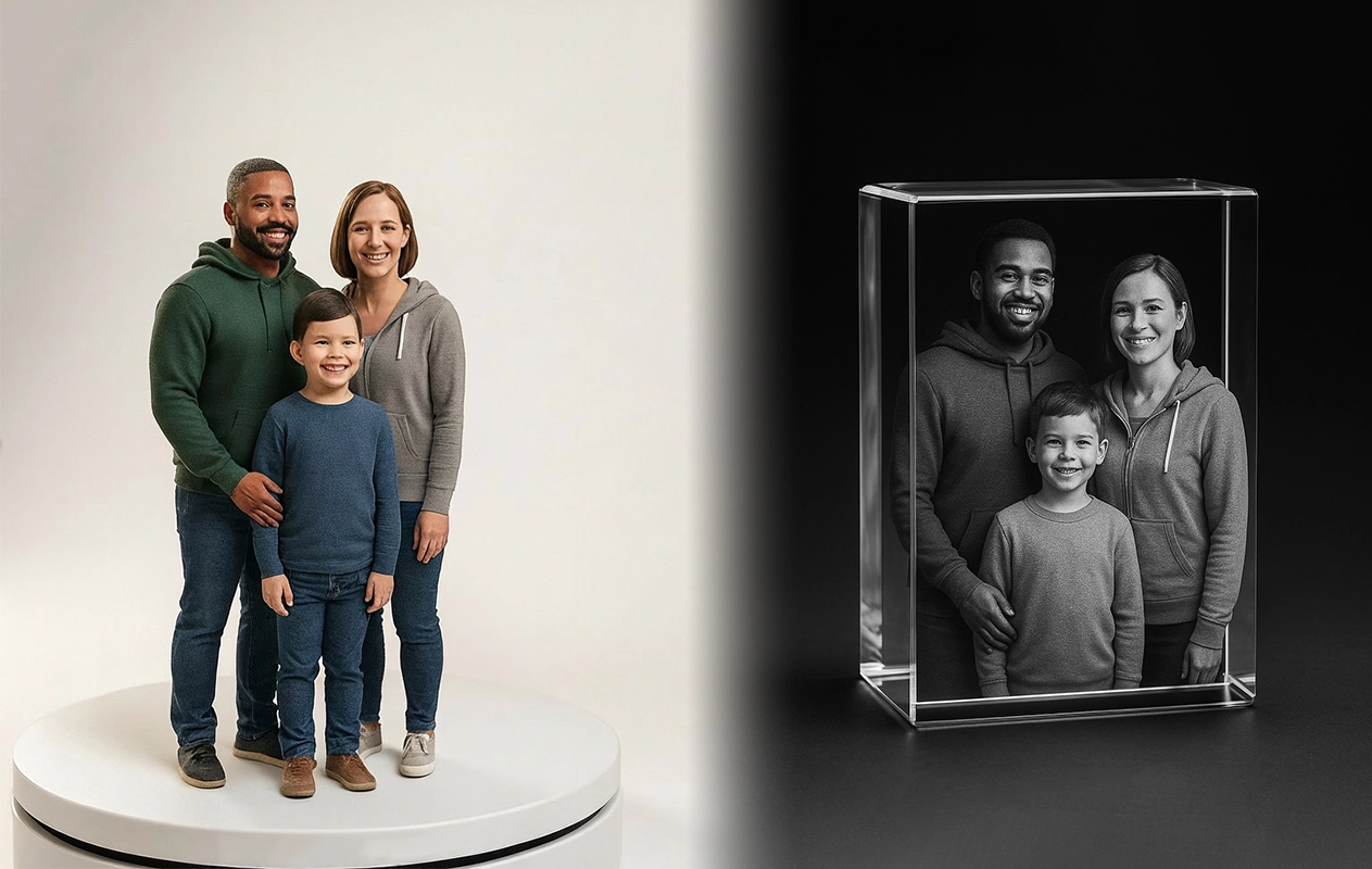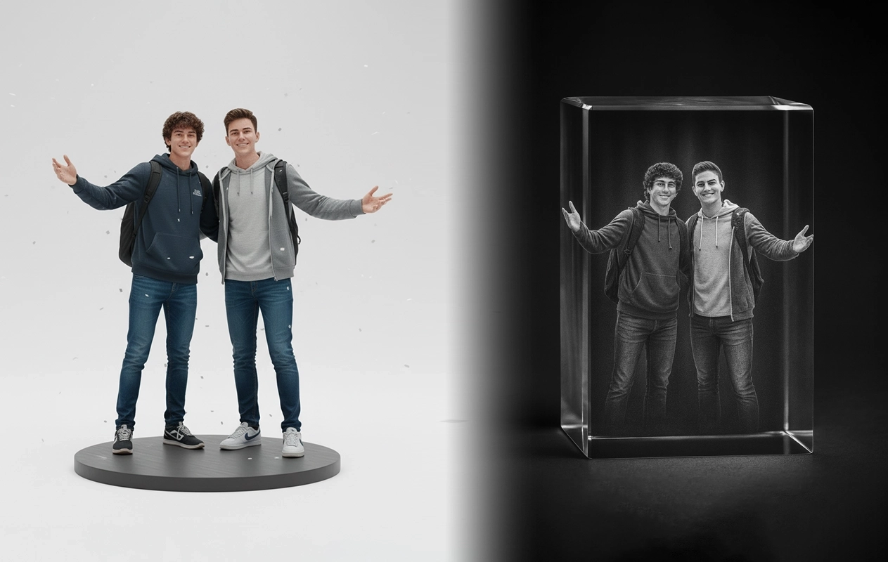 Step into our full-body scanning booth, strike a pose, and preview a lifelike 3D model in minutes. Then choose your size and finish — filament (lightweight), resin (high-detail), or laser-etched crystal. Take home a keepsake no photo can match.